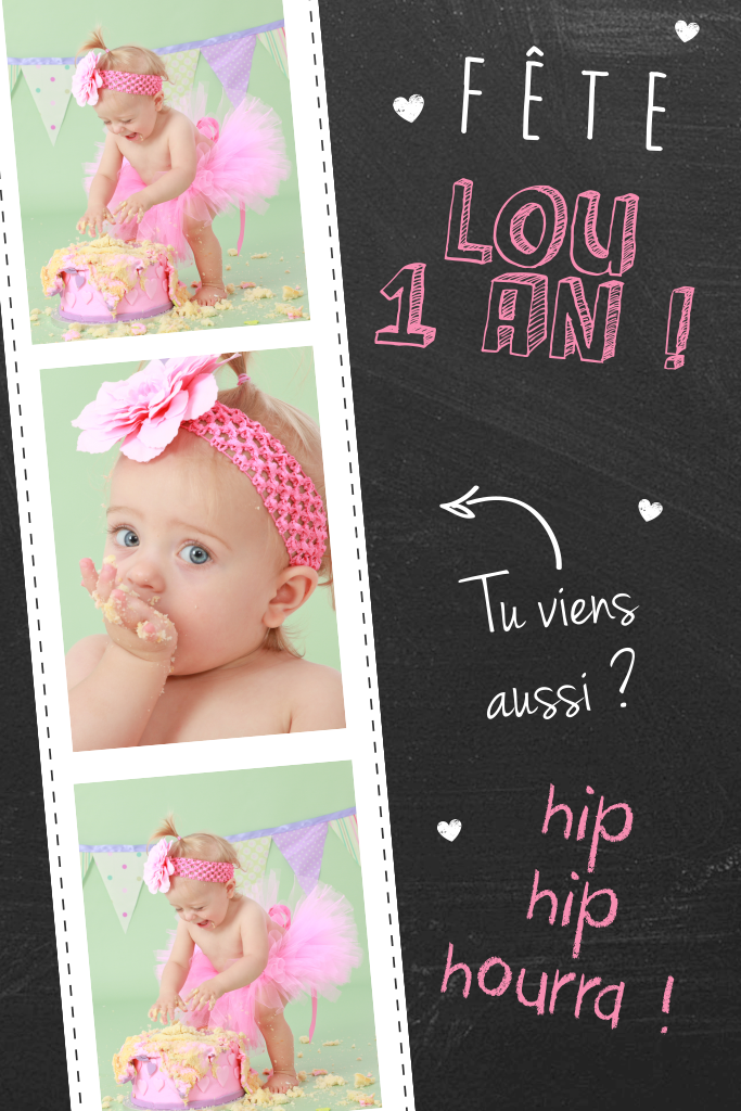 Invitation avec détails roses et bande photo sur fond de tableau noir.