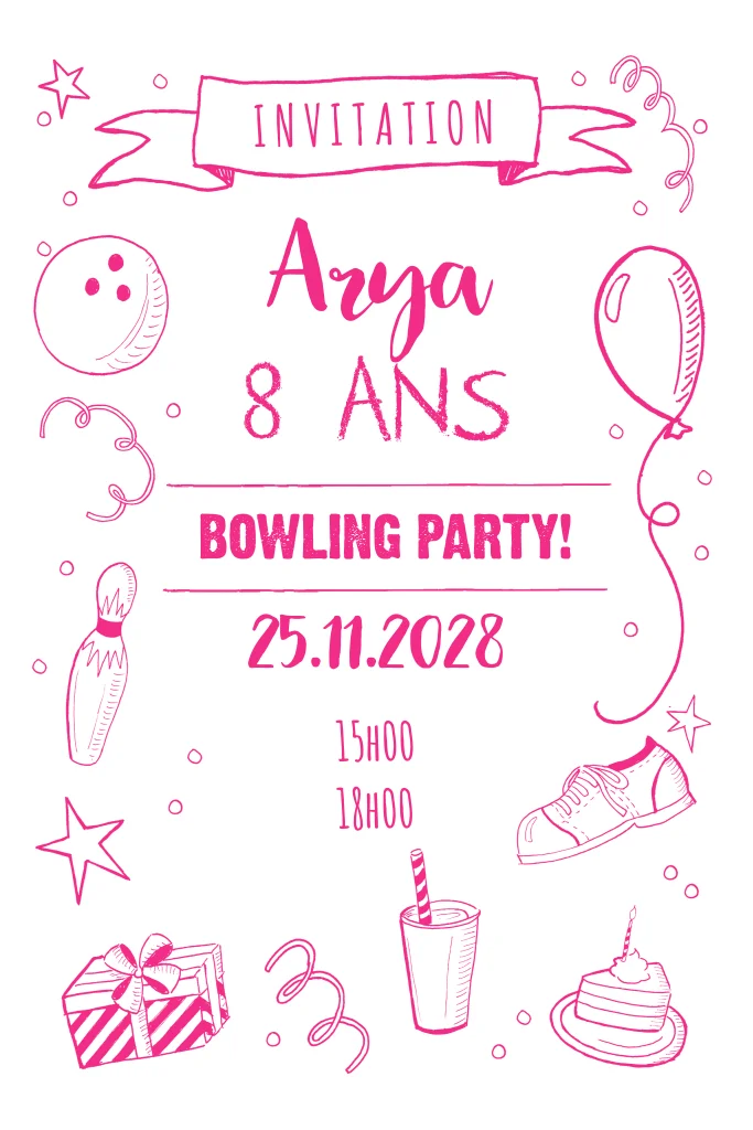 Carte d'invitation à une fête au bowling avec des illustrations roses