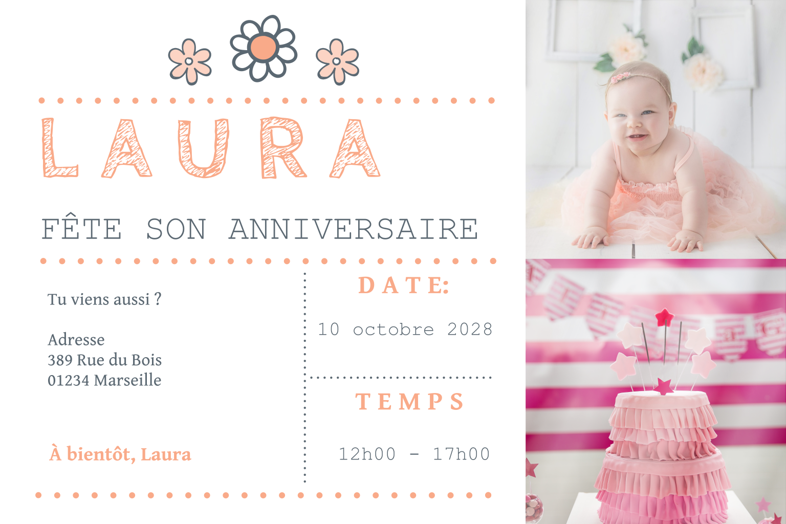 Carte d'invitation mignonne avec des photos et des fleurs.
