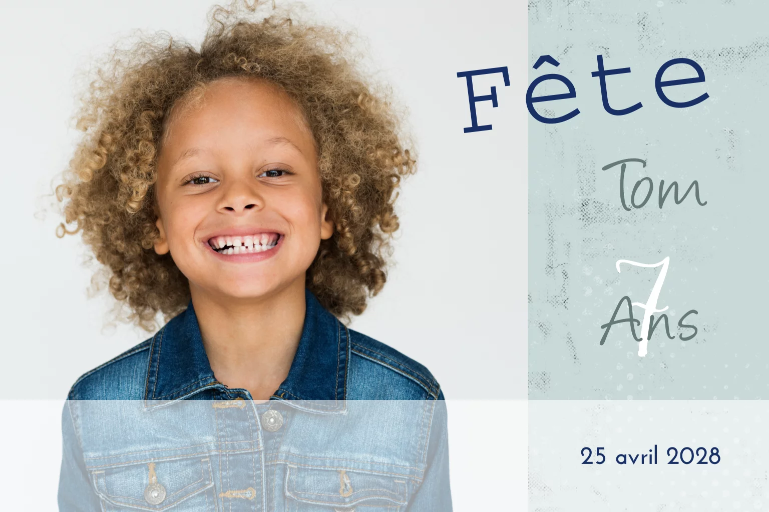 Carte d'invitation jolie avec une photo sur fond bleu.
