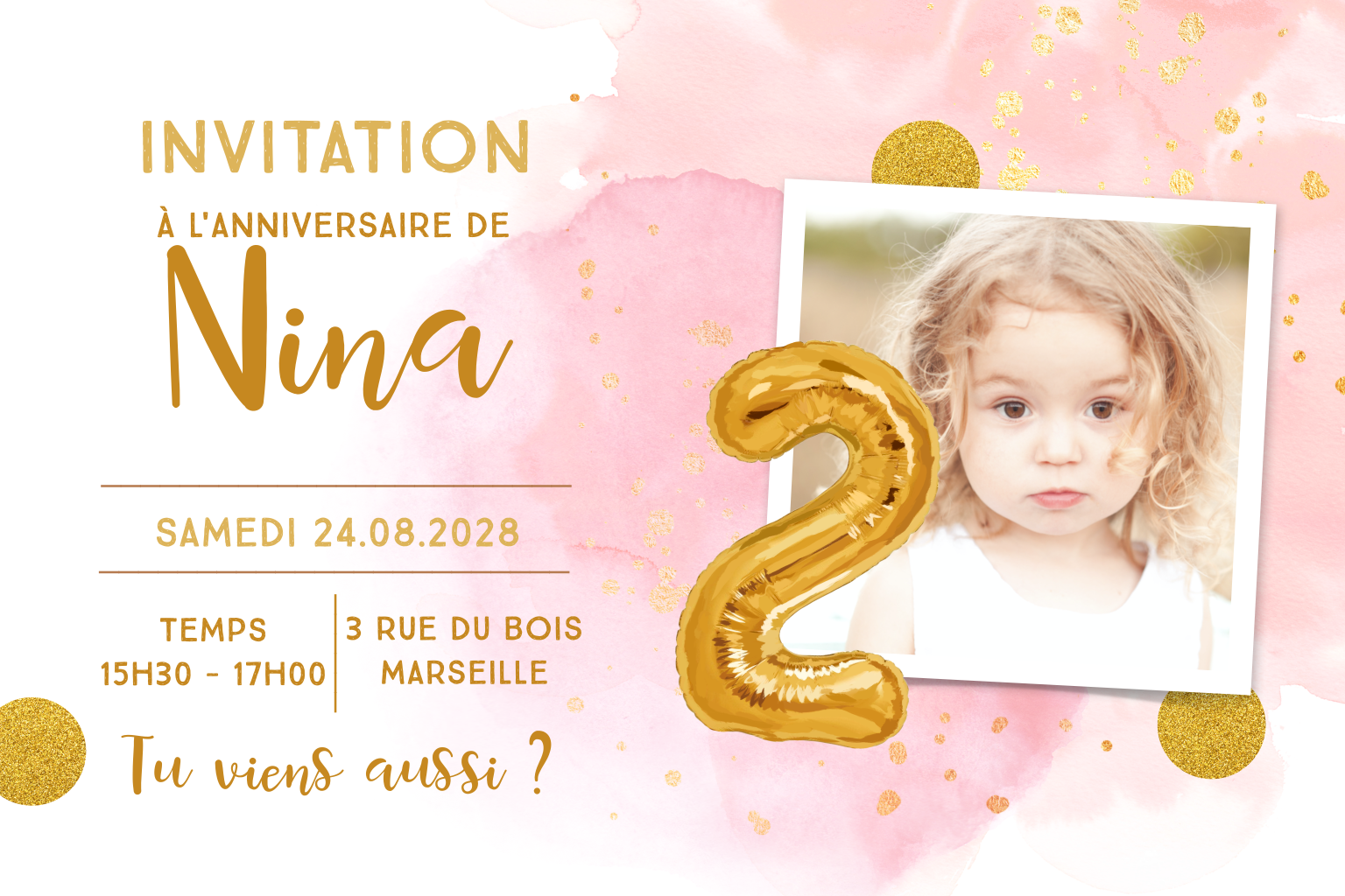 Carte d'invitation douce avec une photo et des aquarelles roses.