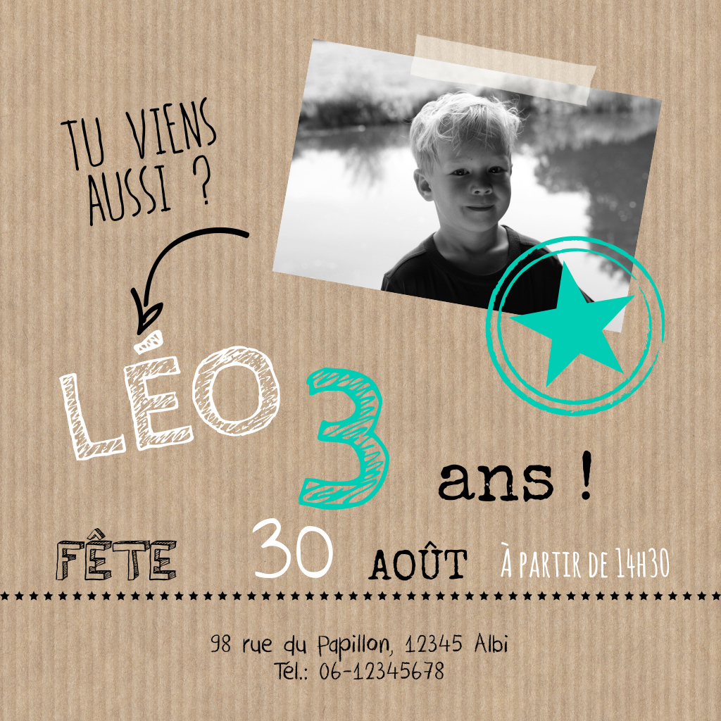 Carte d'invitation moderne avec photo sur fond d'aspect papier kraft.