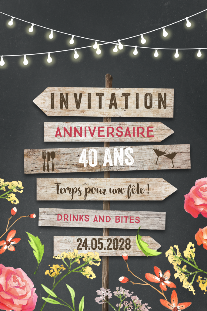 Carte d'invitation joyeuse avec panneau indicateur et fleurs.
