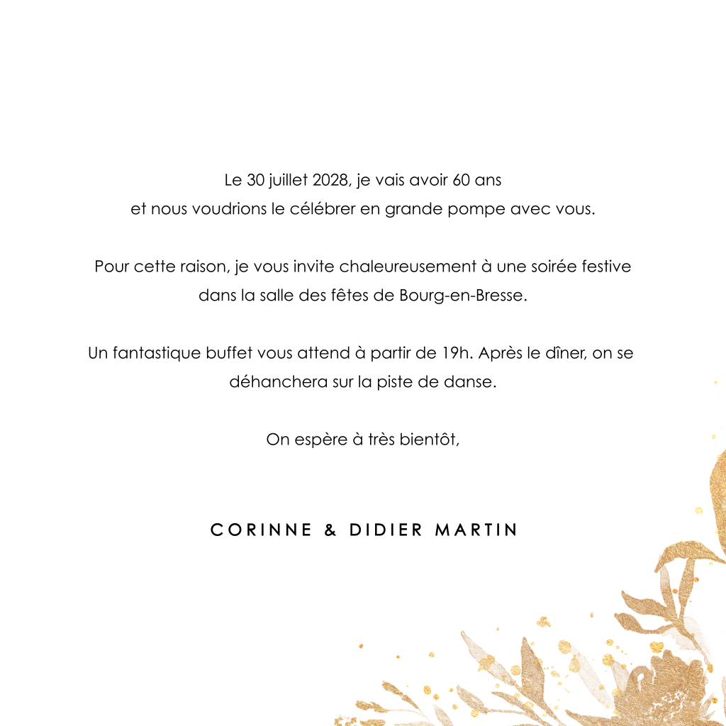 Invitation d'anniversaire pour 60 ans avec des fleurs dorées et des chiffres en ballon.