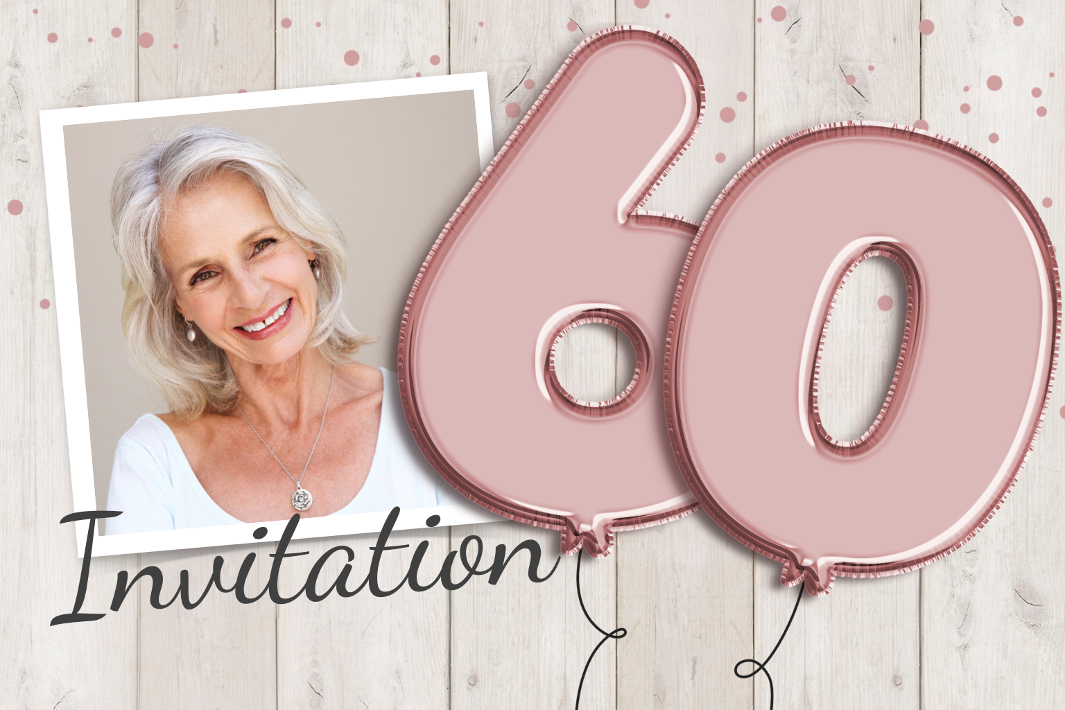 Carte d'invitation pour les 60 ans avec des ballons et une photo