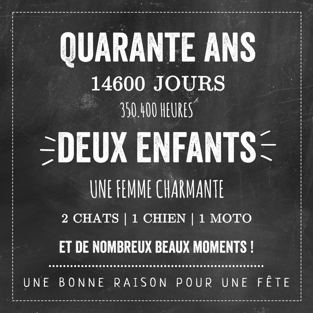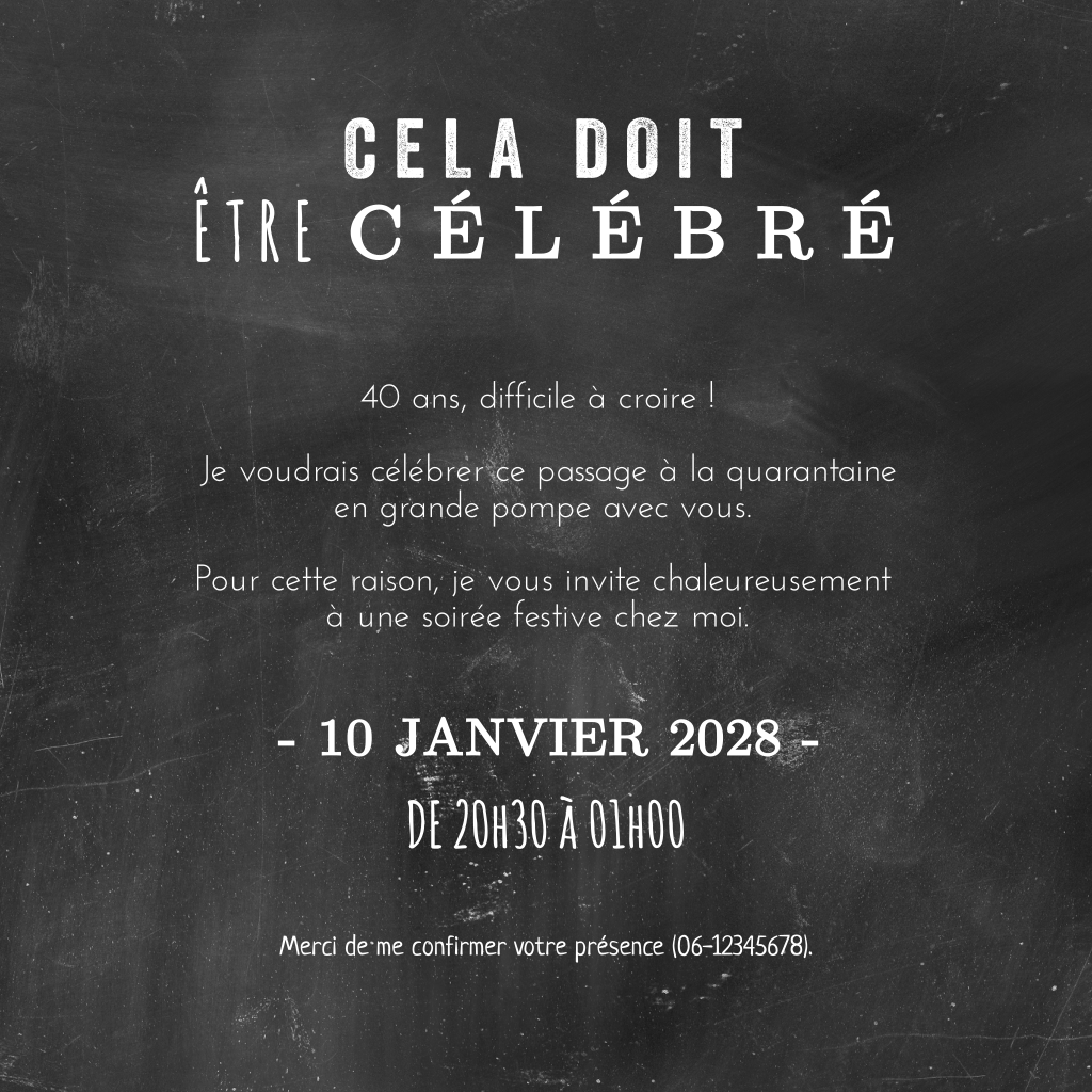 Carte d'invitation originale pour les 40 ans sur fond de tableau noir.