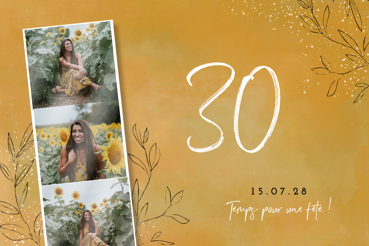 Invitation tendance avec photos et feuillages sur fond jaune ocre