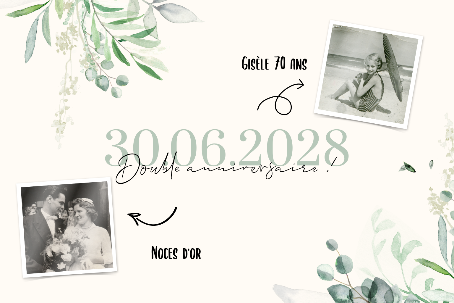 Carte d'invitation tendance à une double fête avec des feuillages.