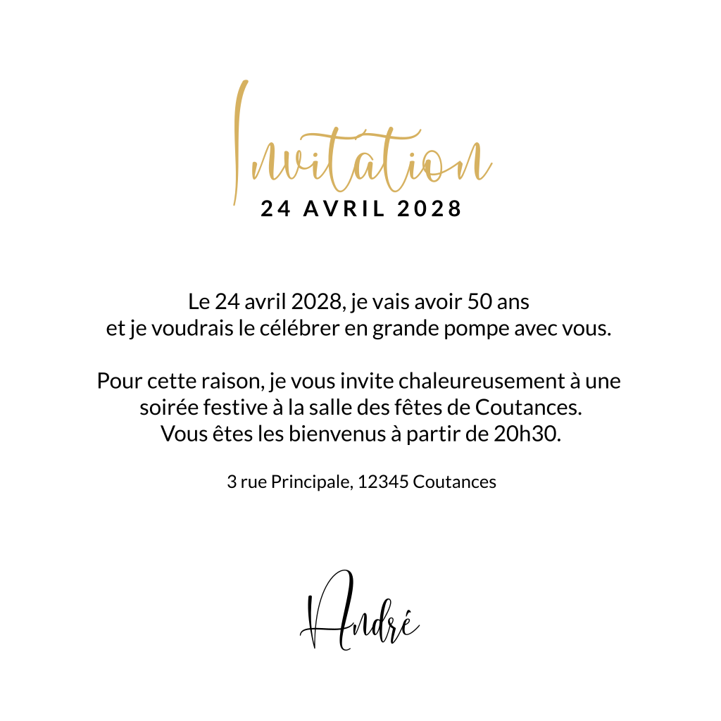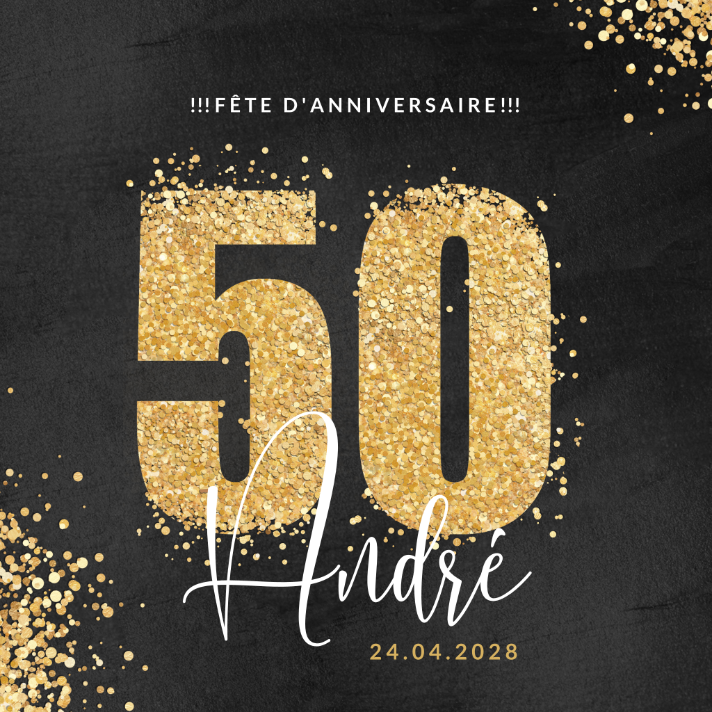 Carte d'invitation élégante pour les 50 ans avec des paillettes dorées.