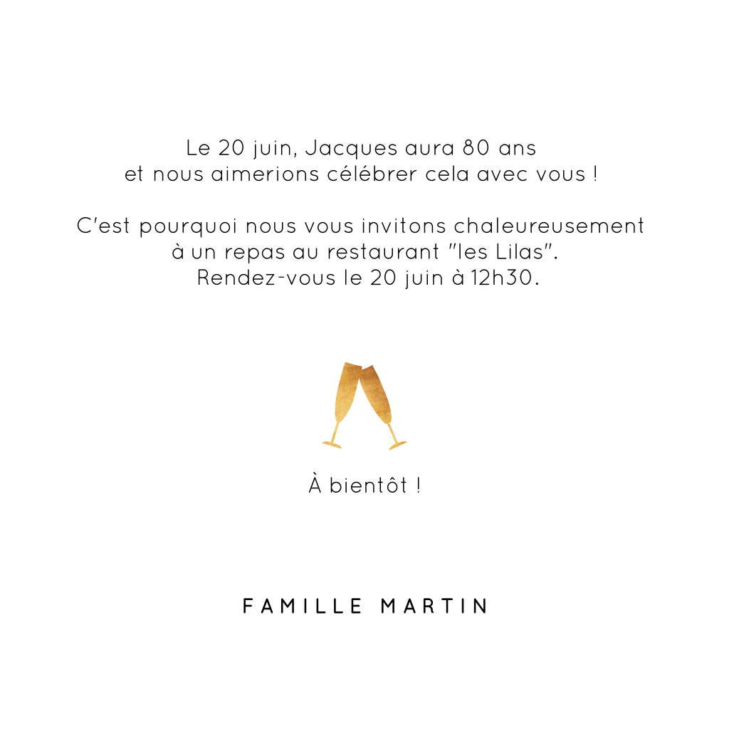 Carte d'invitation pour les 80 ans avec des accents dorés