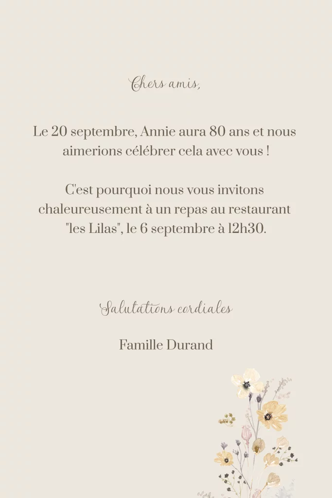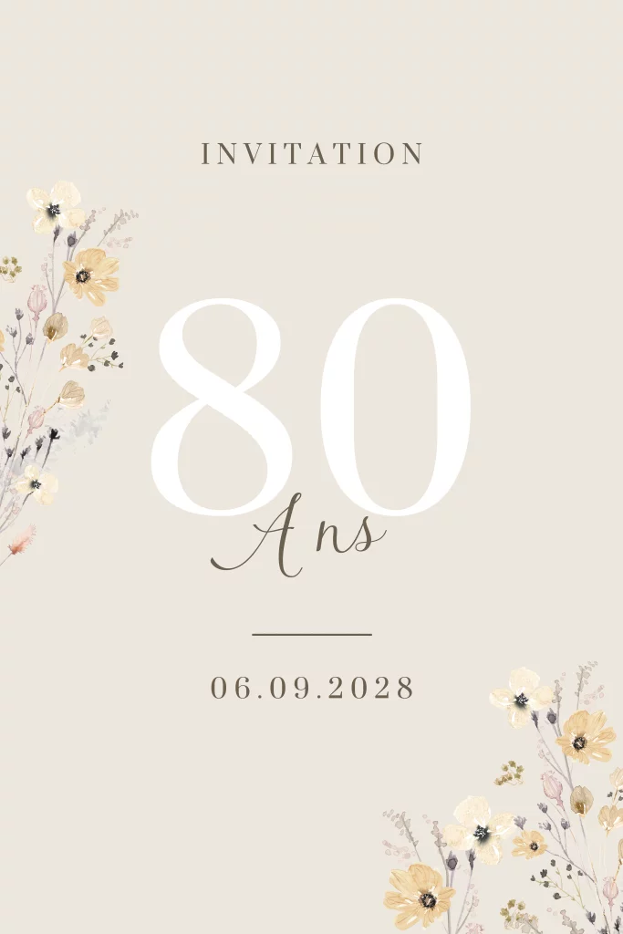 Carte d'invitation pour les 80 ans avec des fleurs des champs.