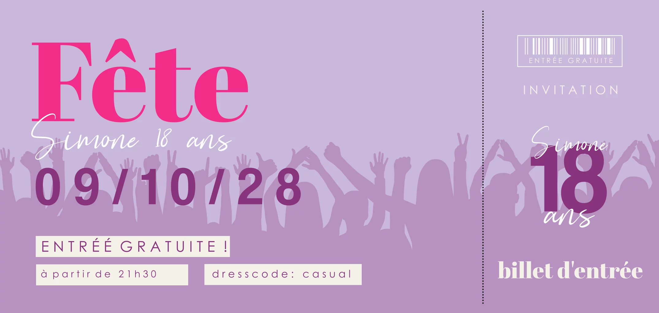 Carte d'invitation pour le 18e anniversaire avec des accents roses et violets.