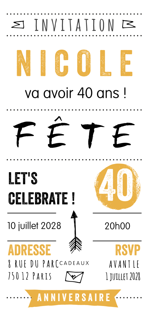 Carte d'invitation pour le 40e anniversaire avec des accents jaunes.