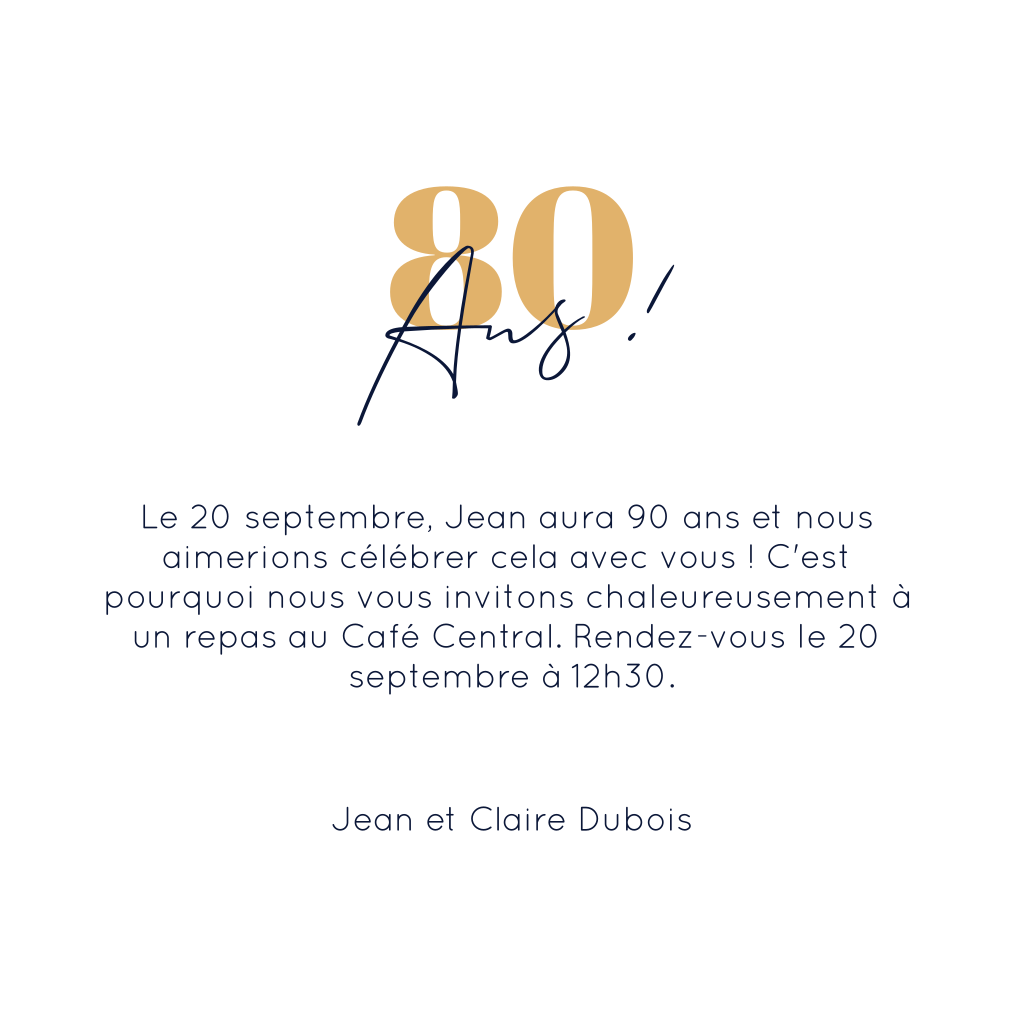 Carte d'invitation pour l'anniversaire avec accents dorés.