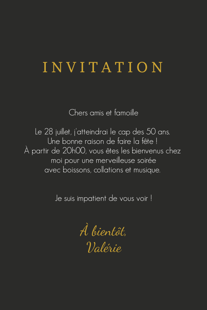 Carte d'invitation classique pour les 50 ans avec des confettis dorés.
