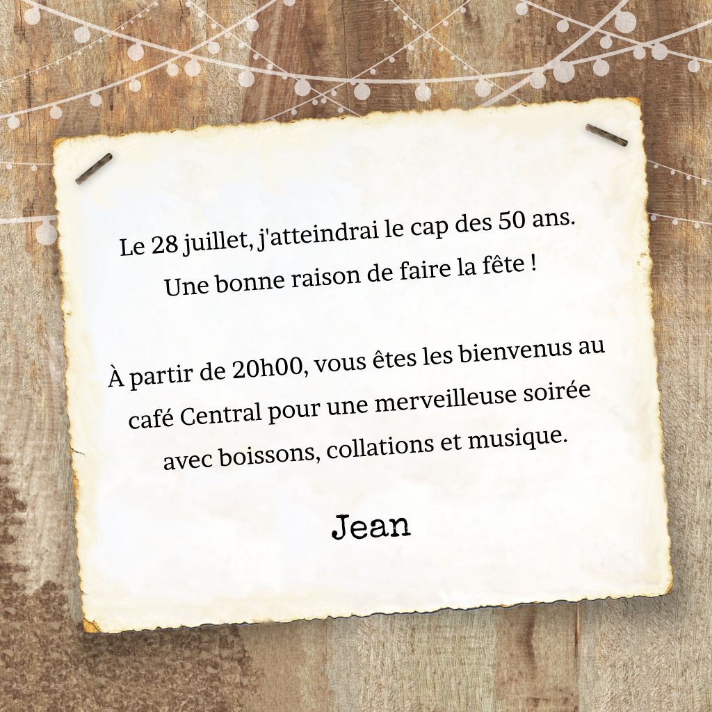 Carte d'invitation pour le 50e anniversaire en bois avec ornements.