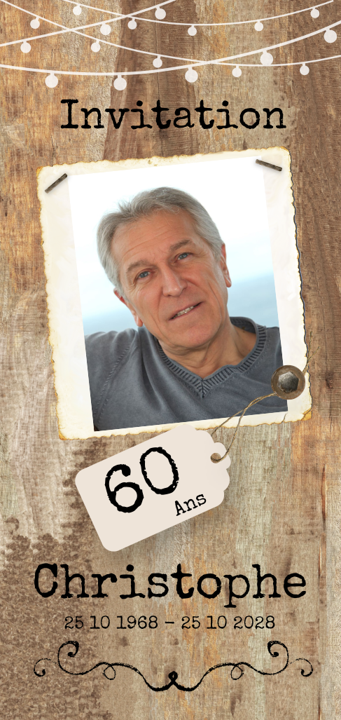 Carte d'invitation pour les 60 ans avec une photo sur fond en bois.