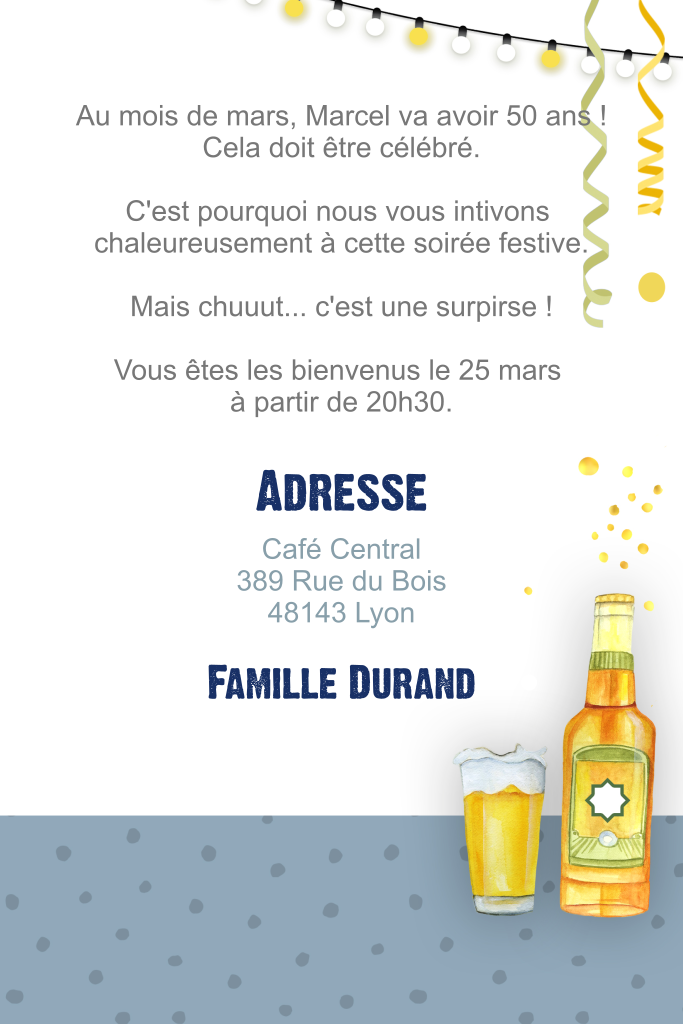 Carte d'invitation joyeuse avec boissons, ballons et guirlandes.