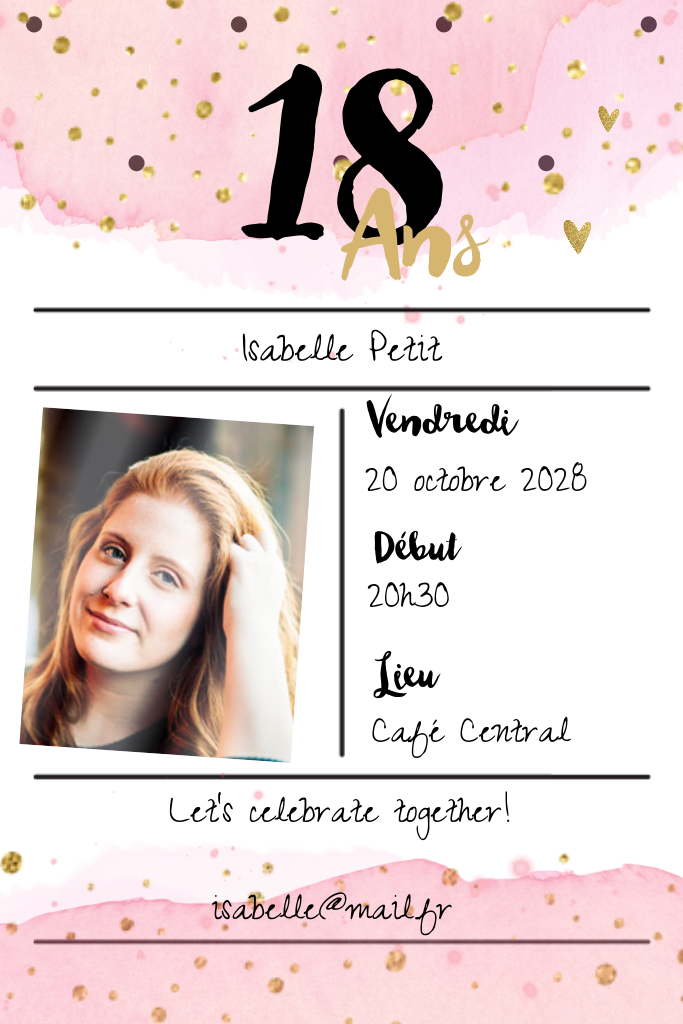 Carte d'invitation festive avec des aquarelles roses et confettis.