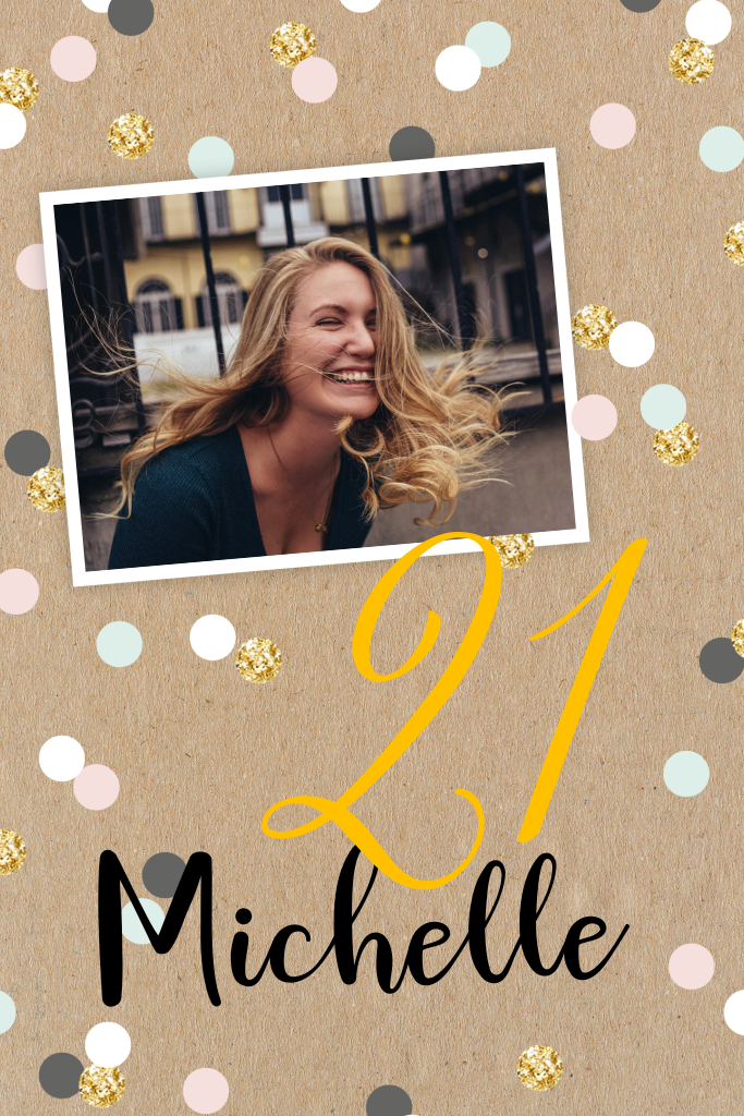 Invitation joyeuse avec photo et confettis sur fond d'aspect kraft.