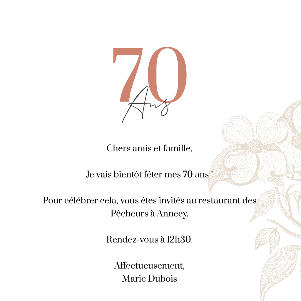 Carte d'invitation pour le 70e anniversaire avec des fleurs dessinées.
