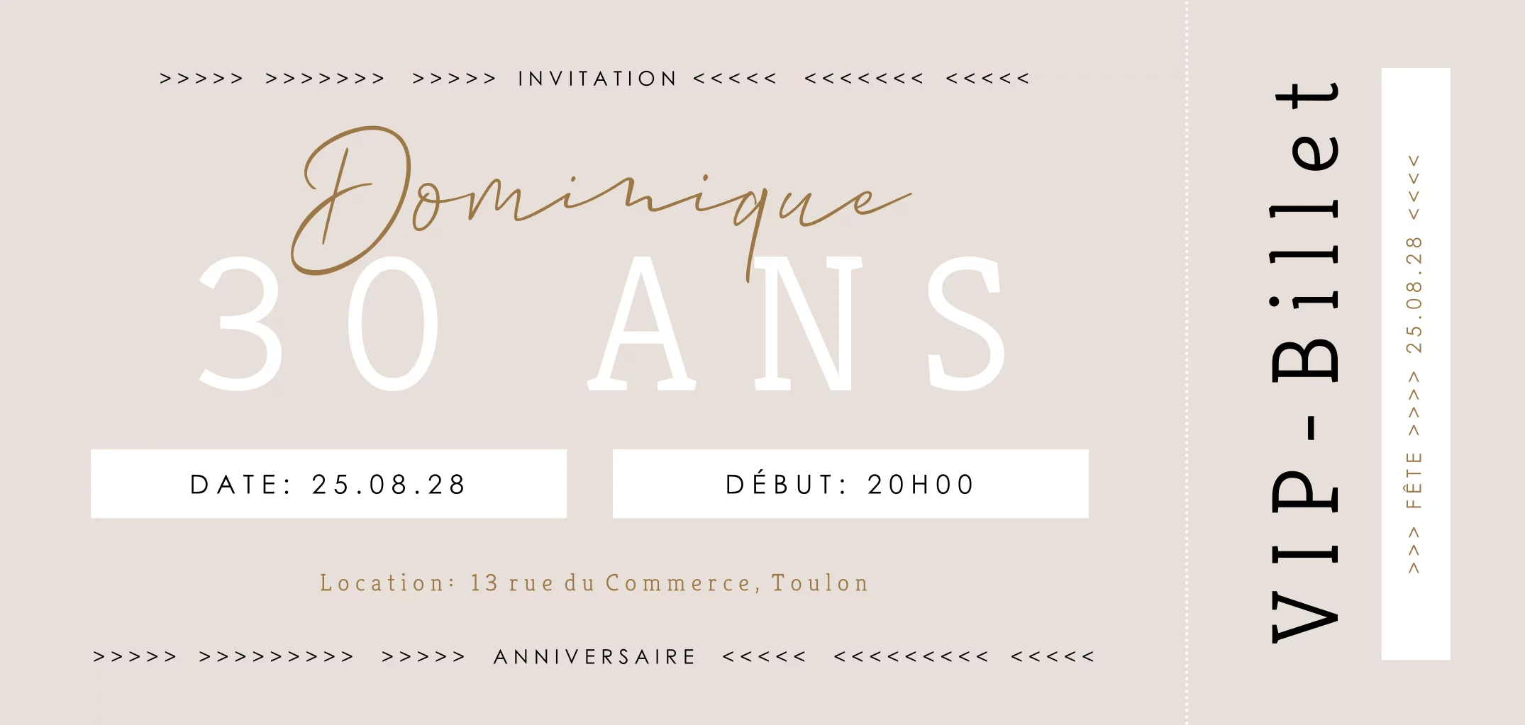 Invitation d'anniversaire sous forme de billet d'entrée dans des teintes rosées.