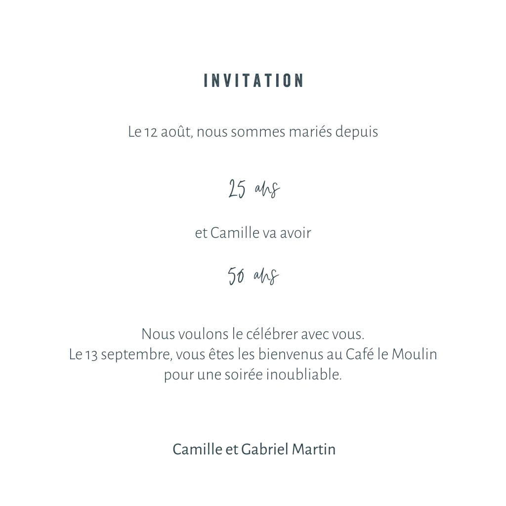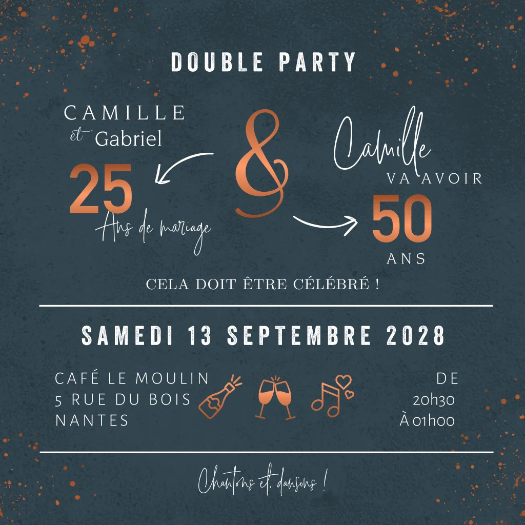 Carte d'invitation tendance à une double fête avec des accents cuivrés.
