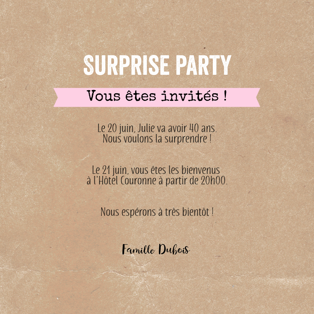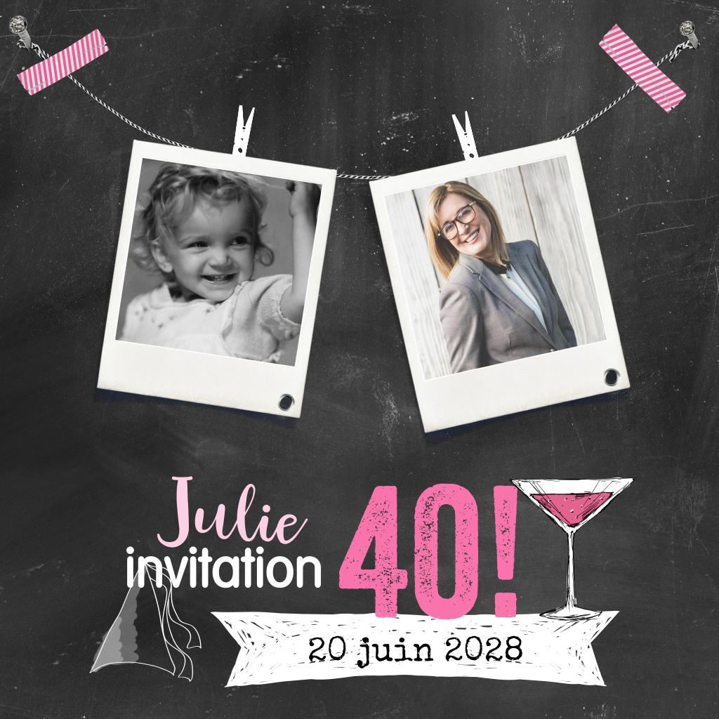 Carte d'invitation avec des accents roses sur fond de tableau noir.
