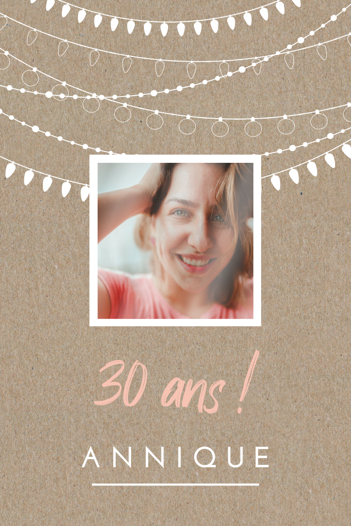 Carte d'invitation au look kraft avec des guirlandes et une photo.