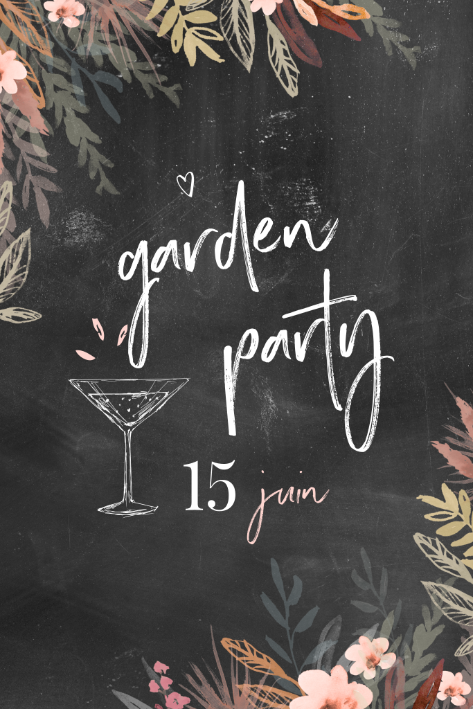 Invitation tendance pour une garden party avec fleurs et feuillages.