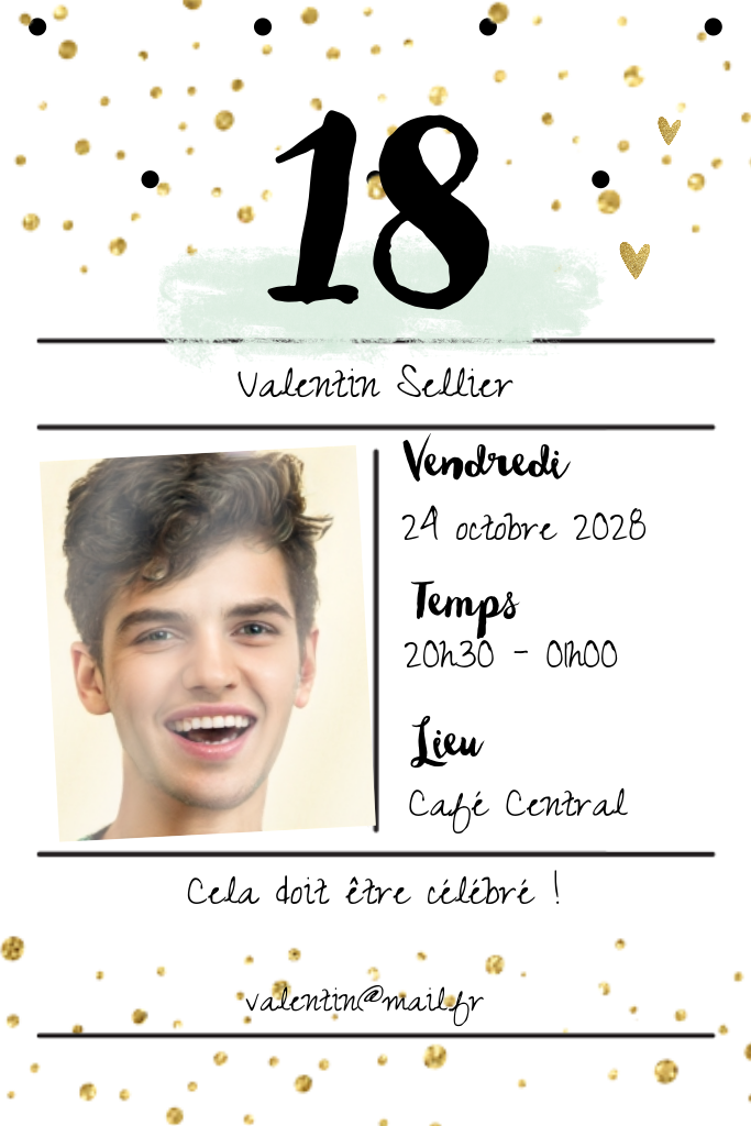 Carte d'invitation moderne pour les 18 ans avec photo et confettis.