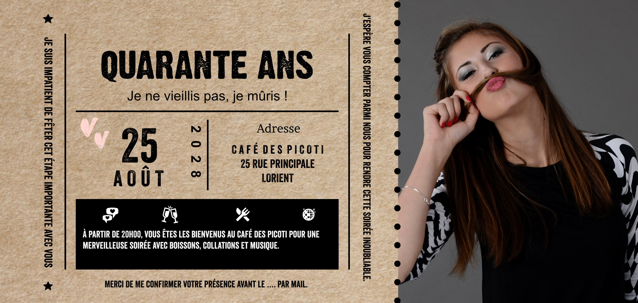 Invitation d'anniversaire sous forme de billet avec aspect kraft