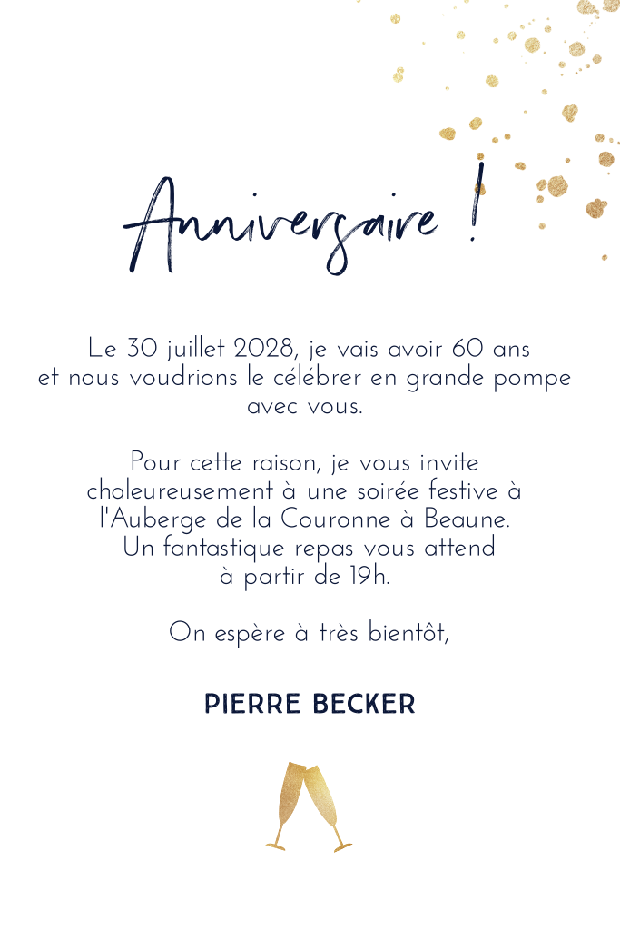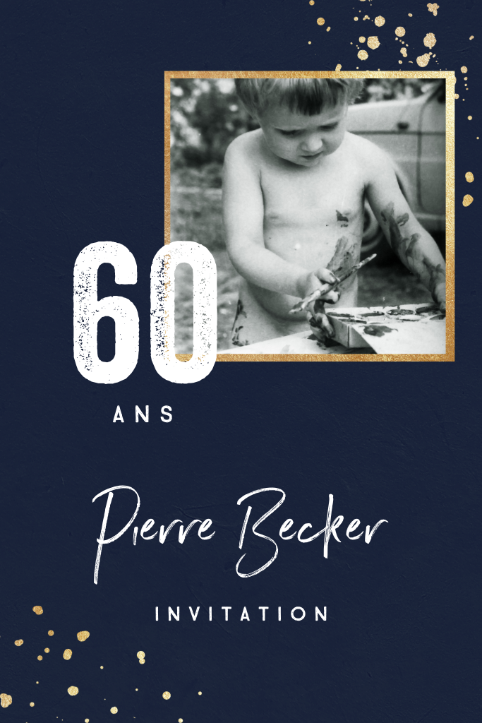 Invitation en bleu pour les 60 ans avec des détails dorés.