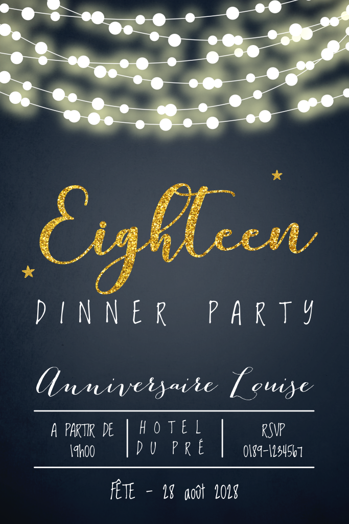 Carte d'invitation pour le 18e anniversaire avec guirlandes lumineuses.