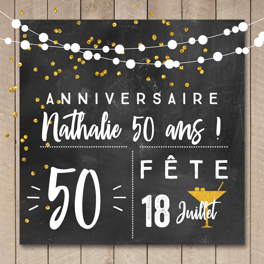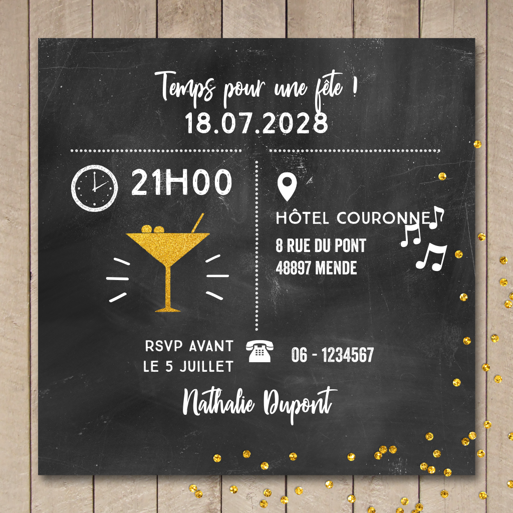 Carte d'invitation d'anniversaire avec guirlandes sur fond en bois.