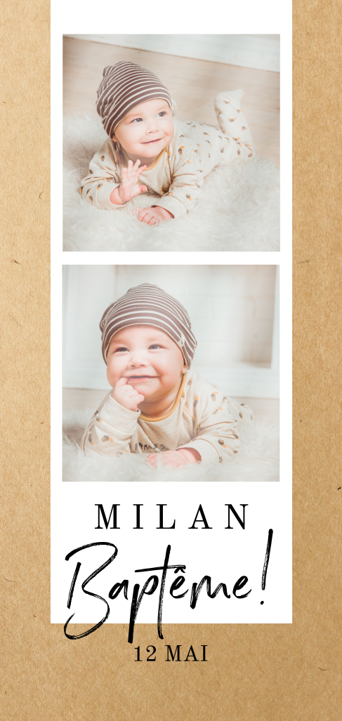 Sur cette élégante invitation au baptême, vous aurez la possibilité d'insérer deux photos du baptisé dans un style Polaroïd.