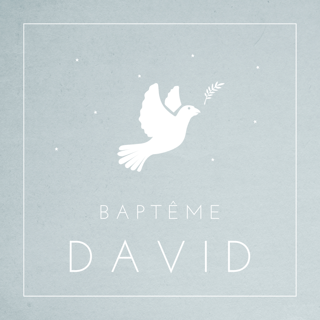 Faire-part de baptême bleu avec une colombe et nom en dorure.