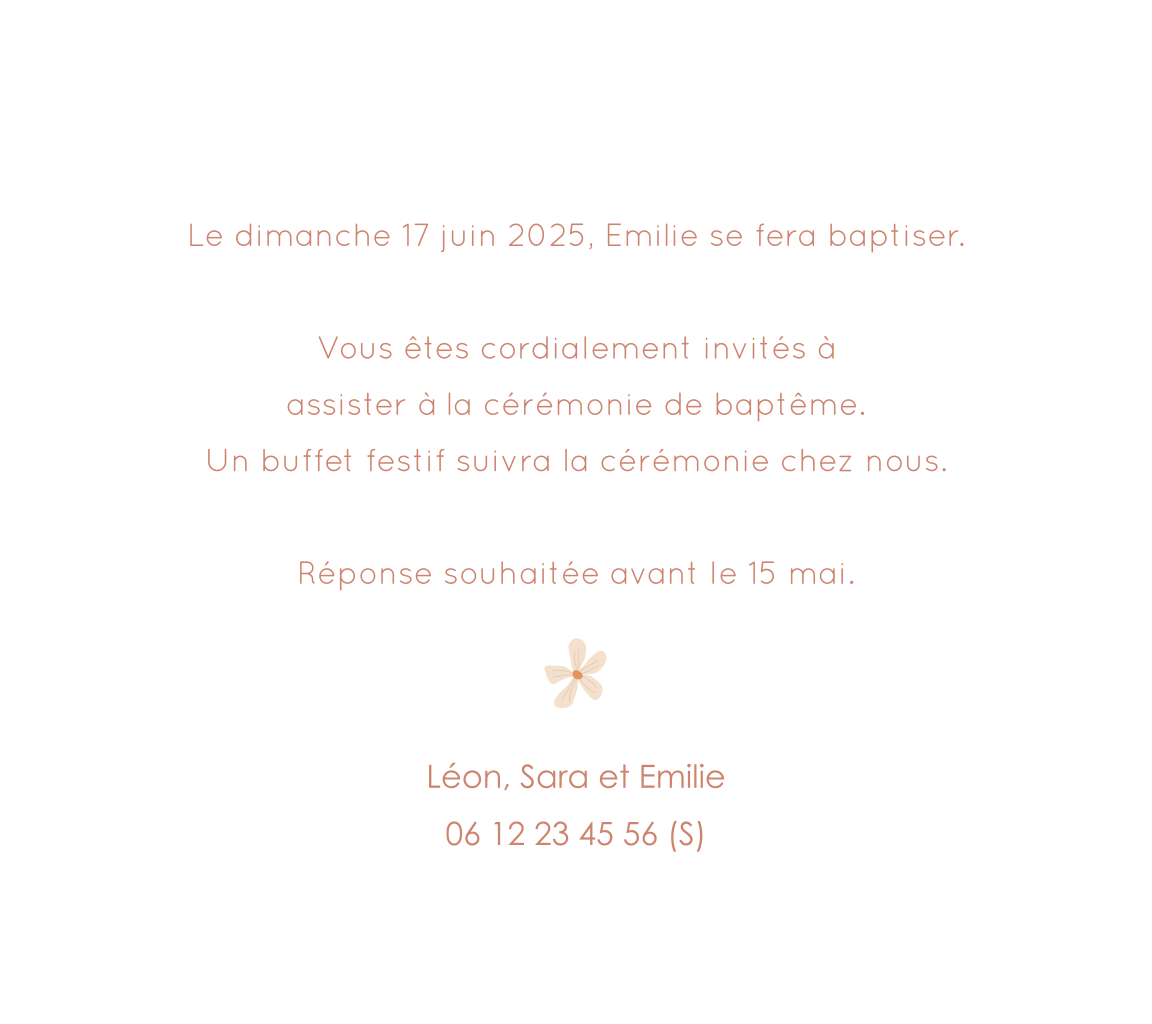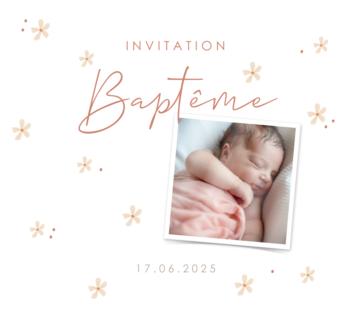 Faire-part de baptême avec des fleurs et une photo