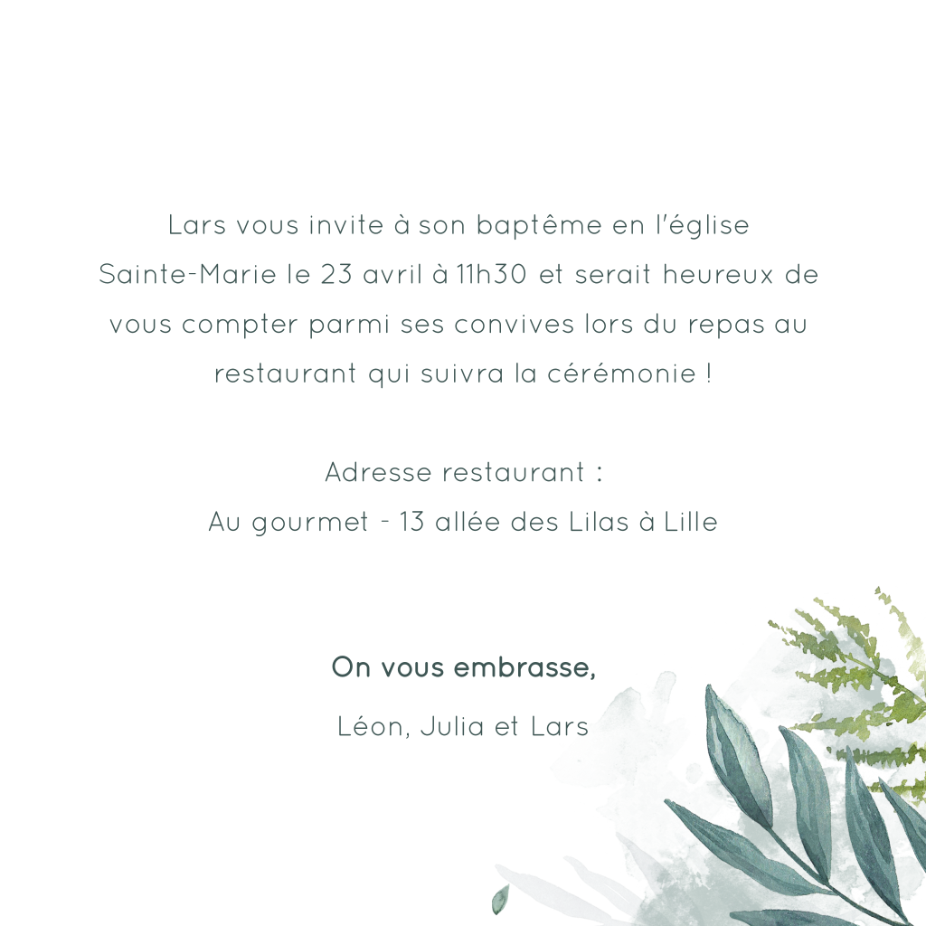 Faire-part de baptême avec des feuillages en aquarelle et photo.