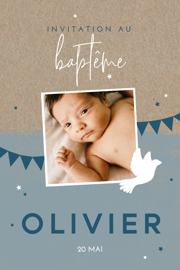 Faire-part de baptême avec guirlandes et photo sur impression kraft.
