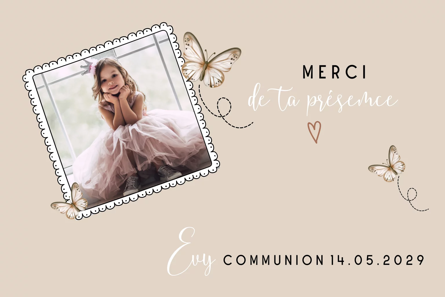 Carte remerciement avec photo, papillons, fond beige.