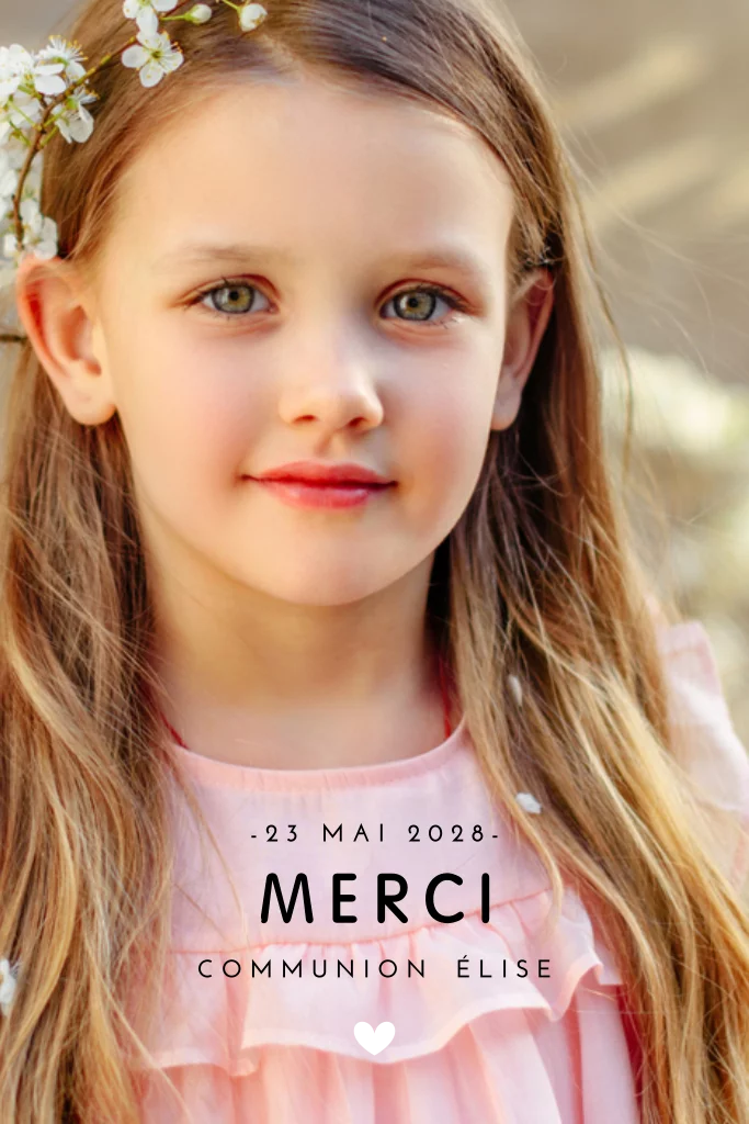 Carte remerciement communion avec photo, coeur, coins arrondis