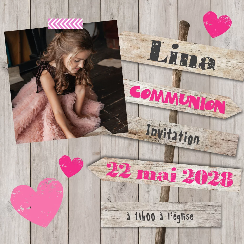 Faire-part de communion avec panneau indicateur et cœurs roses