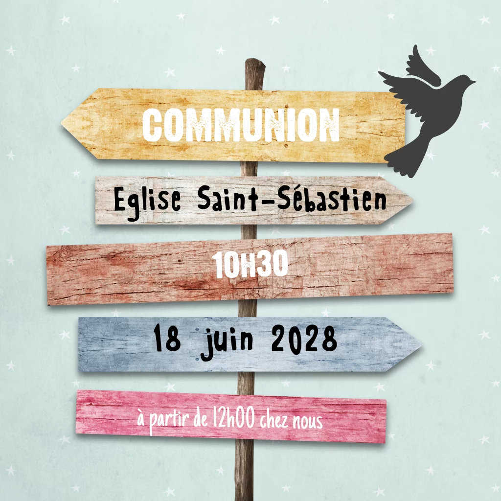 Faire-part de communion avec panneau indicateur coloré et colombe