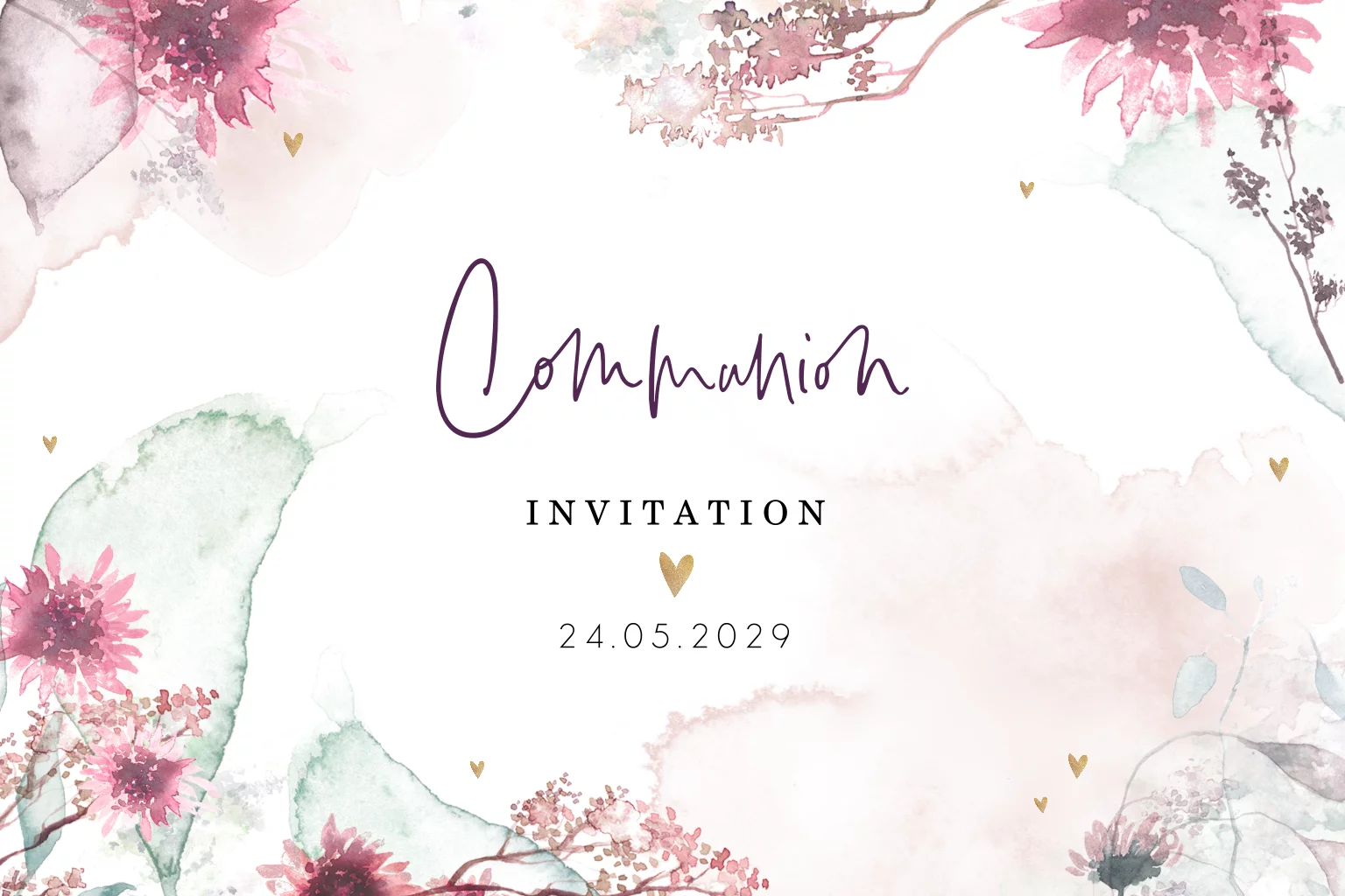 Faire-part communion avec aquarelle rose et coeurs jaune-or