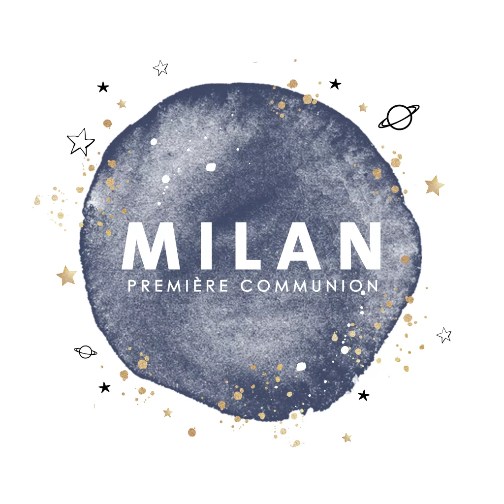 Faire-part de communion bleu avec lune, étoiles et planètes.