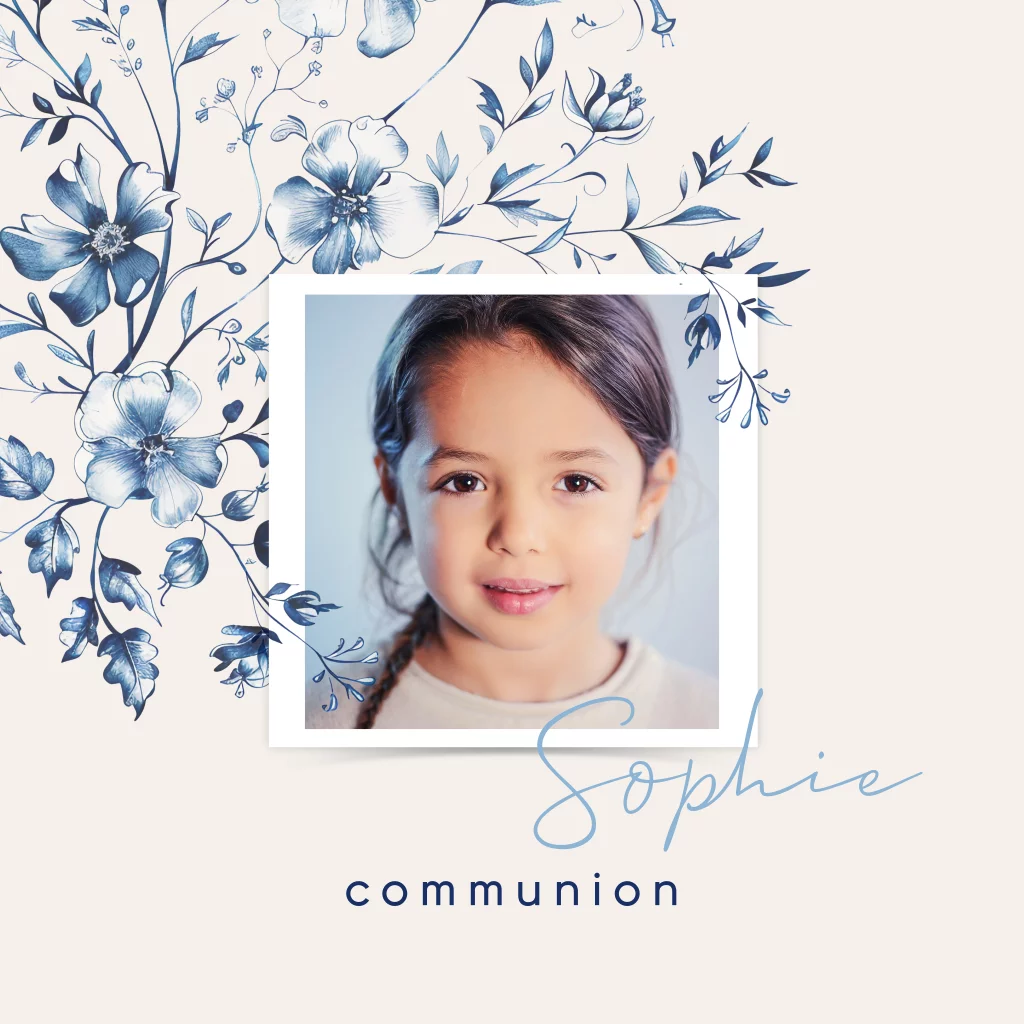 Faire-part communion carré avec fond beige et fleurs bleues.