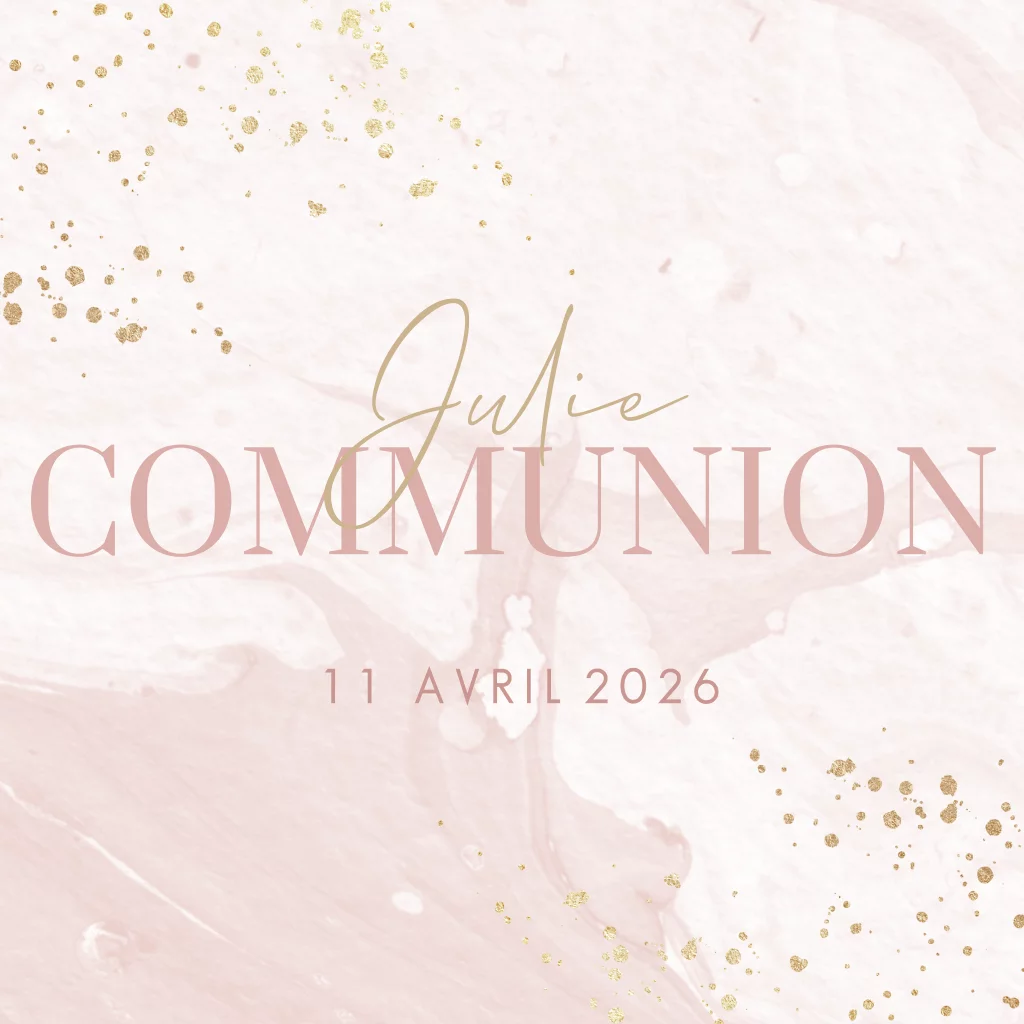 Faire-part de communion élégant sur fond d'aspect marbre rose.
