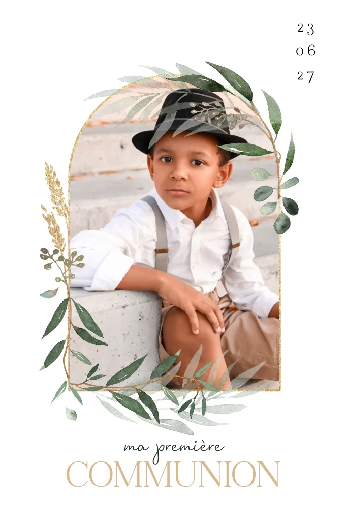 Faire-part de communion élégant avec photo dans cadre de feuilles.