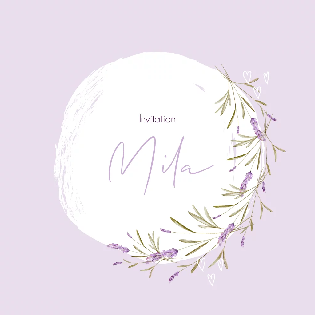 Faire-part communion original avec fleurs violettes et coeurs